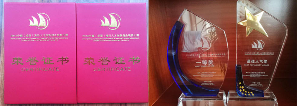 荣获2016中国(成都)海外人才创新创业大赛一等奖、最佳人气奖。中国科协尚书勇书记,成都市委唐良智书记,罗强市长颁奖。